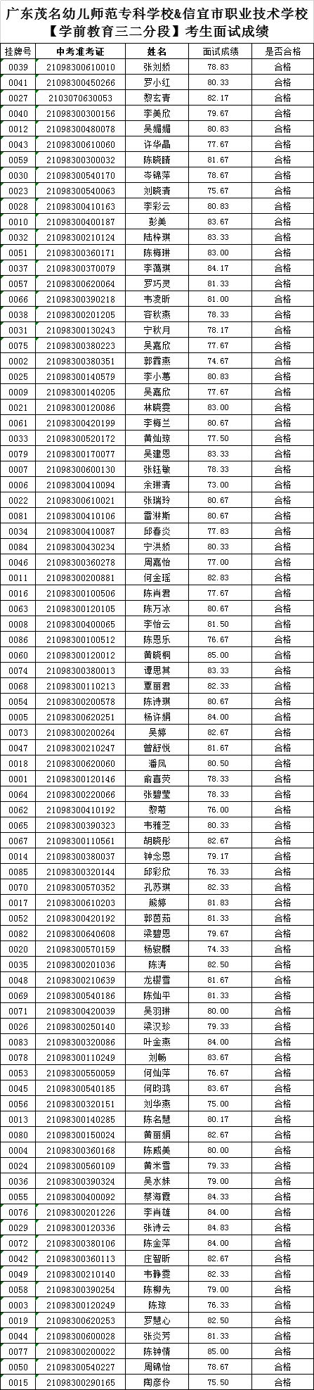 根据《广东省教育厅广东省招生委员会办公室关于开展2021年职业院校中高职贯通培养三二分段试点工作的通知》(粤教职函〔2021〕19号)及我校联合各对口中职学校公布的中高职贯通三二分段【中职学段】招生简章等有关要求,8月28日已完成信宜市职业技术学校面试工作,现将面试的合格名单(见附表)进行公示,公示时间8月28日-9月1日,公示期间如有异议,请联系以下电话反馈: